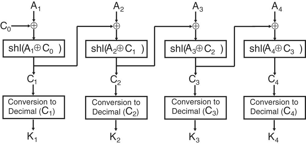Step 4: Convert the element of vector A = [A1, A2, A3, A4] to binary form, such that each element has a maximum data length of 32-bits. After that, each element of vector A is encrypted using the CBC algorithm, in which the value of C0 is a 32-bit key that is randomly generated. The CBC algorithm is chosen because it produces a different symmetric key even though the same vector A is used as the input. Therefore, this algorithm is suitable to generate symmetric keys in which each key component is expected to have a different value. Then, the result is returned to decimal format to obtain symmetric keys consisting of K1, K2, K3, and K4, as illustrated in Figure 5. These symmetric keys are 32 bits long each, so the total symmetric key length is 128 bits. These symmetric keys are then sent via a secure channel.