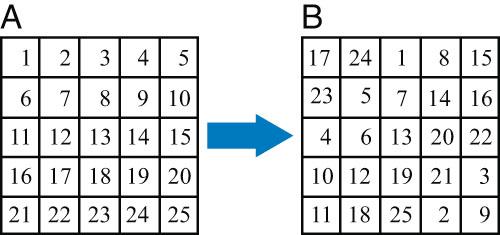 Parameters b and c are positive integers. In this study, the parameters b and c are generated randomly until we find the values of b and c that satisfy Eq. (2). Value [xi, yi] and [xi+1, yi+1] is a nonnegative integer i.e. {0,1, 2, N−1} with N is min (mLL, nLL). [xi, yi] is the position of the original image element and [xi+1, yi+1] is the position of the image element after the permutation is done using ACM.