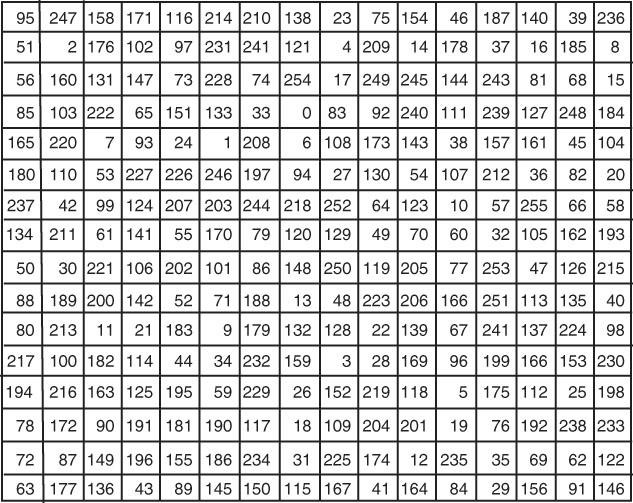 Key KG4 is also an S-Box with the size of 16×16. Each element of the matrix is generated using the Chaos Logistics Map method, similar to the generation of session key KG3. The values of each element should be unique and ranges from 0 to 255. Figure 7 shows an example of session key matrix KG4, which is generated from symmetric key K4 and then normalized to the range of [0,255] using Eq. (6) to obtain KG4 (1,1)=95. The key elements KG4(1,2) to KG4(16,16) are generated using Eqs. (4) and (6).