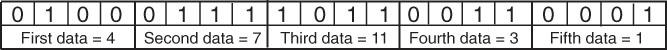 The coding process is then applied to the quantization result. It is started by converting the quantization result of each sub-band to binary form. The results are combined to form 8 bit sized blocks. To illustrate, suppose that 4 7 11 3 1 is the produced quantization-10 data. Conversion of the data to binary form will produce five 4-bit blocks as shown in Figure 9.
