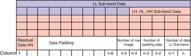 b. The mth row contains the end of HH sub-band encryption data, padding bits, and 6 last pixels which are used to provide the information about the number of rows, the number of padding data and the number of LL sub-band data. Each of the information is stored in 2 pixels; this is because each pixel element has a maximum value of 255, while the stored information may be very large. To store very large data, each information is divided into 2 pixels where the first pixel (col n−5, col n−3, col n−1) contains the integer part of the data division with 256, while the second pixel contains the fraction part (col n−4, col n−2, col n). Hence, the maximum value to store the information is 255×255+255=65,535.