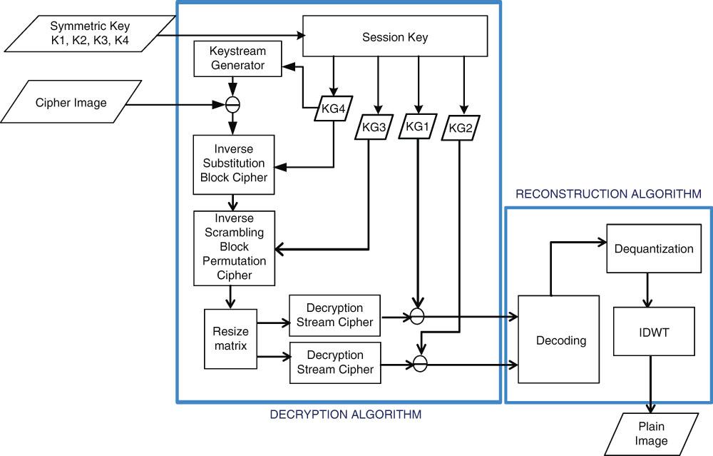The model of image data security on the receiving side is divided into two algorithms, namely: decryption algorithm, and reconstruction algorithm as illustrated in Figure 12.