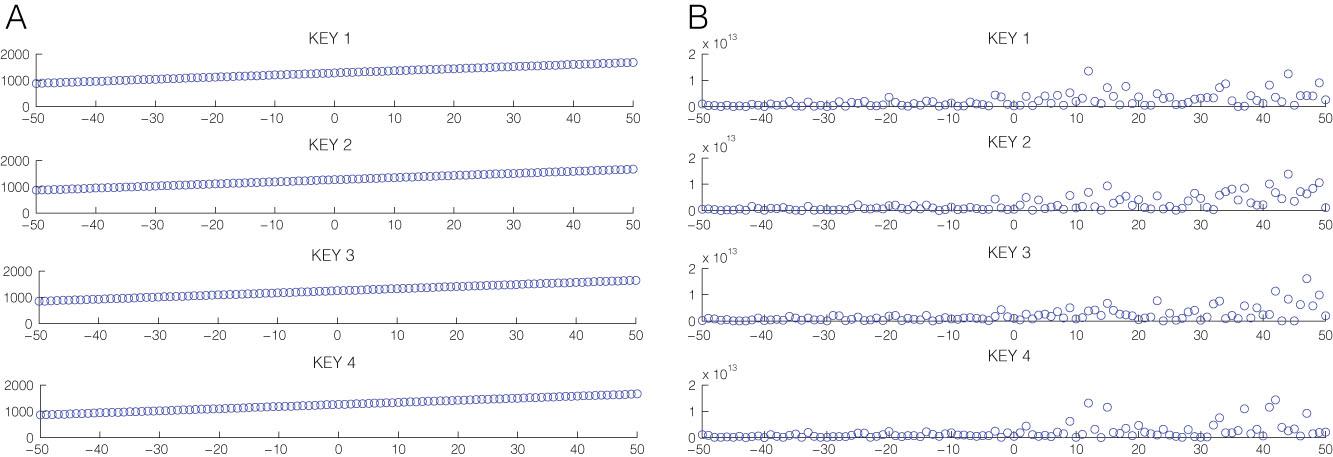 Figure 13 shows the values of symmetric keys obtained from Lena grayscale image of 512 × 512 sizes, with intensity value lowered to 40 and raised up to 40. In Figure 13(A), when the proposed algorithm is not used, if the intensity value is increased, the symmetric key value will rise linearly. However, when the symmetric key is generated using the proposed algorithm, the generated produces symmetric keys are random as shown in Figure 13(B).