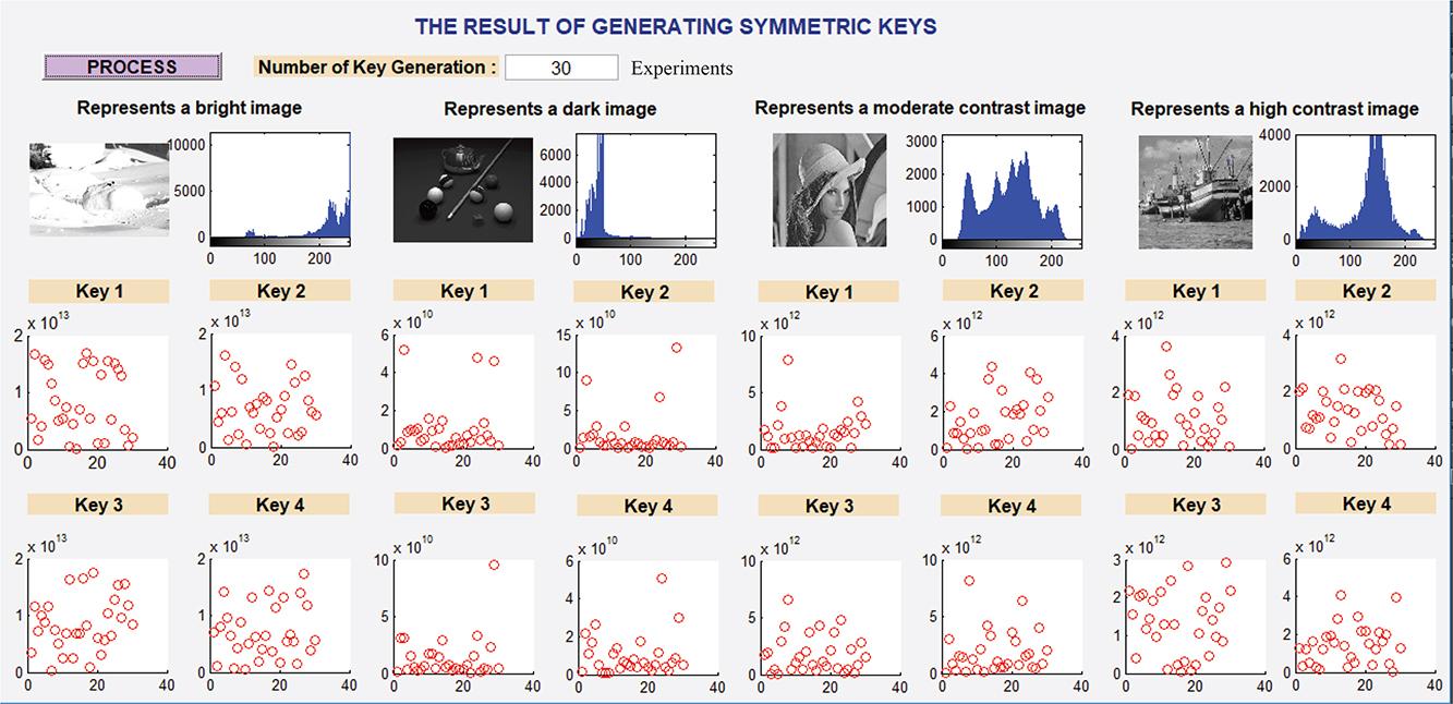 Symmetric keys generated in 30 experiments using Artichare, Pool, Lena, and Boat images.