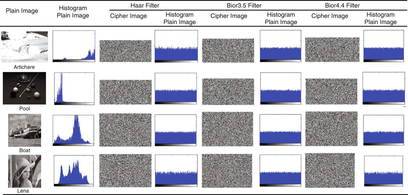 The four images look random, this shows that visually the information on the image cannot be seen. Thus, it can be concluded that the image to be delivered is safe from manual inspection. Furthermore, the cipher image histogram looks flat, indicating that there is no prominent pixel intensity in the cipher image. Hence, cryptanalyst is not able to use the histogram for doing statistical attack. The use of different wavelet filters does not affect the security of the encrypted data, which can be seen from visual tests and histograms that look the same.