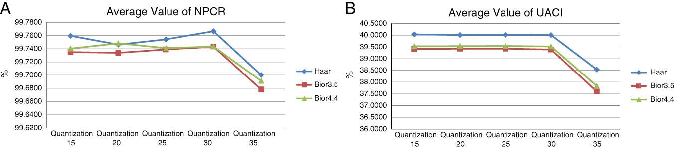 Figure 16 shows the average values of NPCR and UACI of the images using different wavelet filters and quantizations. It can be seen that the average value of NPCR and UACI is the best when Haar filter is used on quantization of 30. The average value of NPCR is 99.7666%, while the average value of UACI = 40.0053%. It also shows that the proposed algorithm is secure against differential attacks.