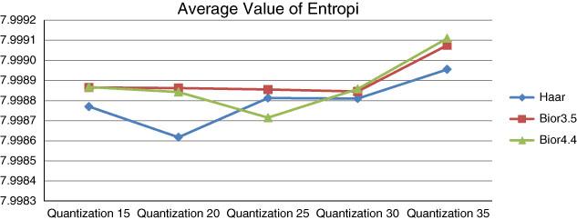 Figure 17 shows the average of entropy value using different filters and quantizations. It can be seen that if the quantization value is greater, the average entropy value is also greater using either Haar, Bior3.5, or Bior4.4 filter. The average entropy values for all scenarios is above 7.9989, which means the proposed algorithm is safe against the entropy attack. The best entropy value is 7.9991, which is obtained when the Bior4.4 filter is used with a quantitative value of 35.