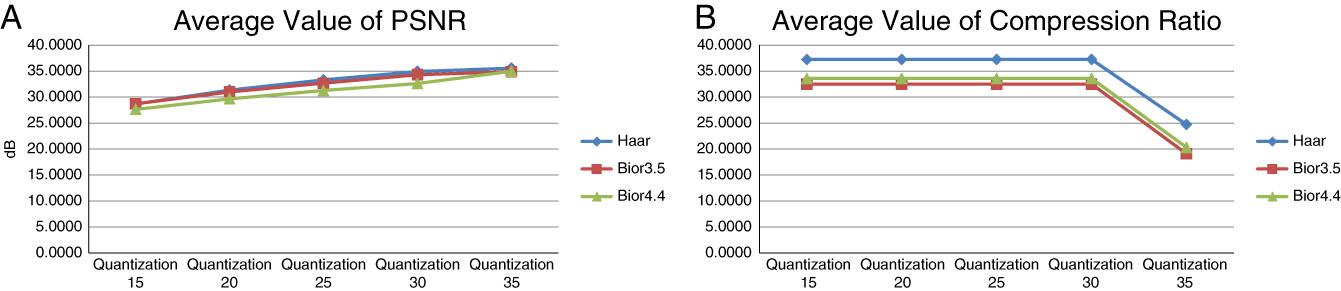 Figure 18 shows the value of PSNR and compression ratios of the four images. It can be seen that the greater the quantization value, the better the image reconstruction quality. In contrast to the image ratio, the average image compression ratio starts to decline when the quantization value is 35. This is because the quantization process using the value 35 will result in compression from 8 bits to 6 bits, which means that the size drops only 2 bits per data element, whereas, for another quantization value, the compression is from 8 bits to 5 bits per data element. The best image compression ratio is 37.2338, which is obtained when haar filter is used with a quantization of 30. This means that the proposed algorithm can reduce data redundancy by more than 37%. The best average PSNR is 35.5645 dB, which is obtained when haar filter is used on quantization 35. However, this produced rather low average compression rate. When haar filter is used with the quantization value of 30, the PSNR value is still quite good at 34.9380 dB, while the compression ratio is around 37. Hence, it can be concluded that to get high ratio performance with good quality image data, Haar wavelet filter can be used with a quantization value of 30.