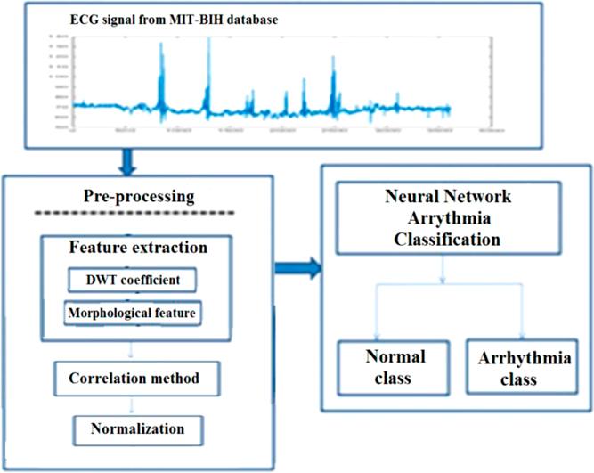 This paper is organized as follows. In “Materials and methods” section, the proposed arrhythmia classification methodology is described. In this section, we begin by presenting the arrhythmia database MIT-BIH. Then, we present the feature extraction as well as the used feedforward artificial neural networks. Next, we detail the experiments and results in “Experiments and results” section. In “Discussion” section, a comparative study is discussed. Finally, a conclusion is reached.