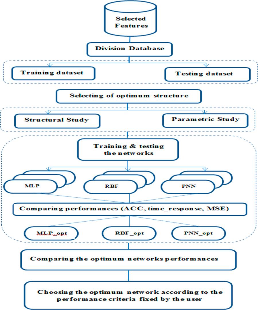 Hence, according to the users’ criteria, the DSS will choose one of the optimum structures. In fact, it will select RBF_opt, if experts want an accurate response regardless of the classification time_response. However, if users want a fast response, DSS will select MLP_opt (Test_time = 0.007 s). Whereas, when users have a huge dataset, it is required to choose PNN_opt since it consumes the lowest learning time (Tr_time = 0.06 s).