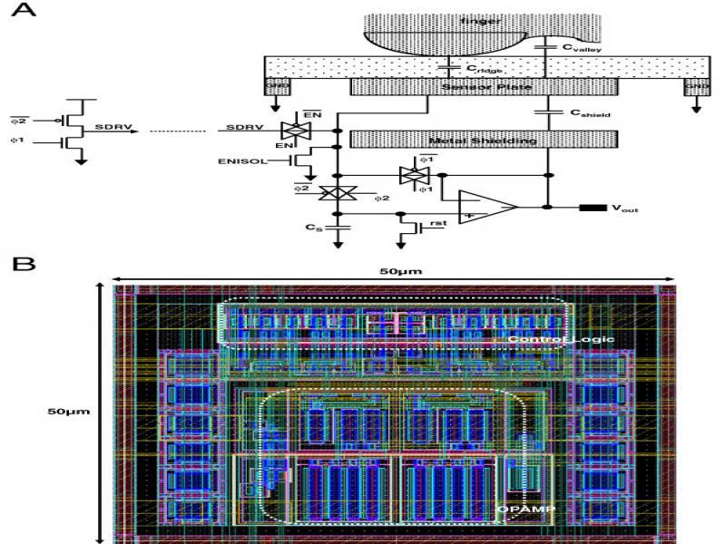 Fingerprint sensor cell (A) circuit for isolation scheme of sensor cell (B) implemented layout of the sensor cell.