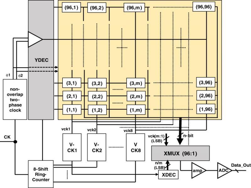 The eight column signal generators, V_CK1~8, generate a reset and an evaluation signals for the column sensor cells. Every eight column cell receives the same clock signal generated from the column signal generator. Therefore, the depth of the pipelined scan can be extended up to 8 which means the eight sensor cells can be evaluated simultaneously.