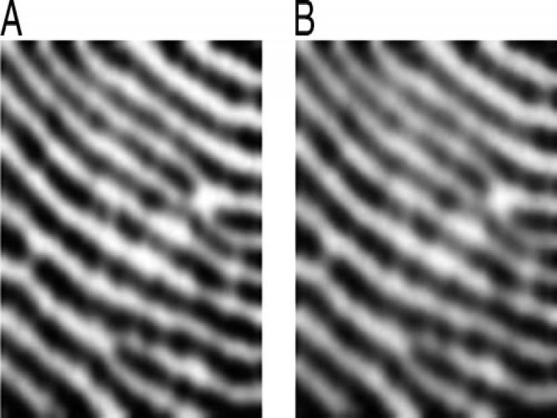 2D Gaussian filtered fingerprint images (A) local size of 3 × 3, (B) local size of 5 × 5.