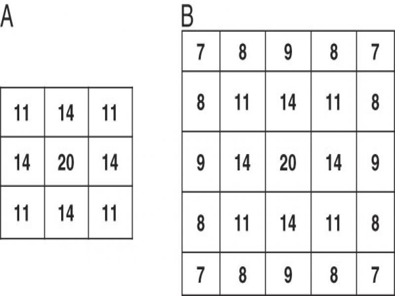 Weight of 2D Gaussian filter (A) 3 × 3, (B) 5 × 5.