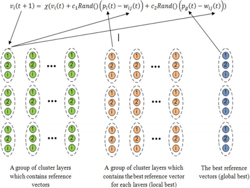 In a previous research, Jatmiko et al. added optimization process for FNLVQ training. The authors applied particle swarm optimization (PSO) algorithm to train FNLVQ, which resulted in FNLVQ-PSO (Jatmiko et al., 2009). PSO is an optimization algorithm that uses colony of agents to find the optimum value (Kennedy, 2011). In FNLVQ-PSO, optimization is used to find the best reference vector. The fitness value to measure the reference vector is the training error or matrix similarity analysis (MSA). The structure of FNLVQ-PSO is shown in Figure 12.