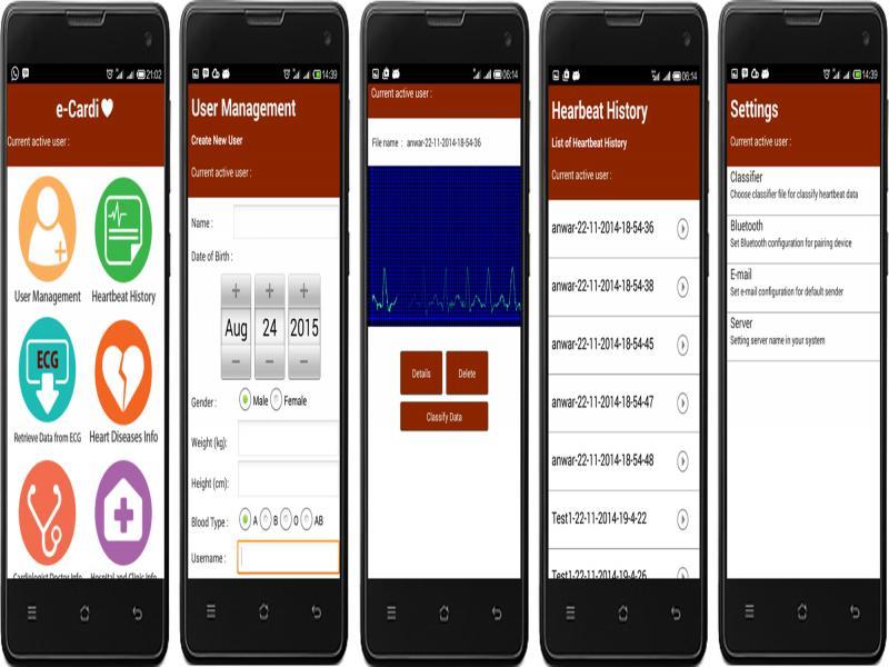 In the previous research, smartphone is the component for visualizing, classifying, and saving/storing the user’s heartbeat data. The application is deployed as mobile apps in Android operating system. The view of the Tele-ECG mobile application is shown in Figure 24. The application has several menus to accommodate the users for heartbeat monitoring and early detection of heart diseases. The menus are retrieve heartbeat data from ECG, heartbeat history, user management, cardiologist information, hospital information, heart disease information, doctor’s special menu, settings, and help.
