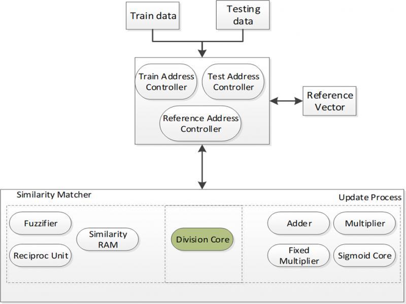 The classification module is the implementation of FLVQ algorithm for classifying the data. The component of this module consists of input data RAM, vector reference RAM, expected value RAM, neuron component, similarity divider component, updater component, and state machine. The input data RAM is the location for storing the output of the preprocessing process from the wavelet decomposition. Meanwhile, the vector references RAM is used to store the vector references that come from the output of the fuzzification process. The neuron component is responsible for measuring the similarities of each feature; meanwhile, the similarity divider component has a role to determine the winner vector. Moreover, the winner vector is updated by moving or changing the shape of the corresponding fuzzy triangle based on the update case by the updater component. The output of this classification process is stored in expected value RAM. The design of the FLVQ architecture in FPGA is shown in Figure 28.