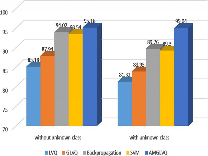 There are two scenarios, without unknown class and with unknown class. In this evaluation, AM-GLVQ is compared to backpropagation, GLVQ, LVQ, and SVM. The experiment results are shown in Figure 35. For both scenarios, AM-GLVQ achieves the highest accuracy among all the algorithms. AM-GLVQ reached 95.16 and 95.04% accuracy for the data set without unknown class and with unknown class, respectively. As shown in Figure 35, in the dataset with the unknown class scenario, the accuracy of many classifiers decreased when compared to the scenario without unknown class in the dataset. The reduction of accuracy varies from 3 to 4%. However, AM-GLVQ can still maintain its performance in scenario with unknown class.
