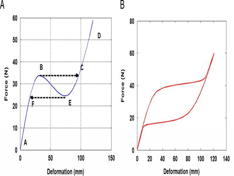 (A) Recovery force of SMA spring; (B) observed hysteresis in simulation results.