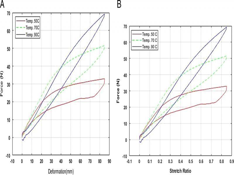 To obtain the pseudoelasticity of single-crystalline SMA spring at first, the heating chamber was heated to (50oC, 70oC, and 90oC) which are above the critical austenite-martensite phase transformation temperature 308K (35°C) of the SMA spring sample. The spring was then extended to the length of 85 mm at a constant speed on the tension test machine and then reverted back to zero position at the same speed at each of the above temperature. The corresponding tracked force–deformation values were recorded in a computer through a loading cell as shown in Figure 4A. For the convenience of simulation and comparison, the deformation of SMA spring is rescaled by dividing with 100 in order to make its absolute value less than 1.