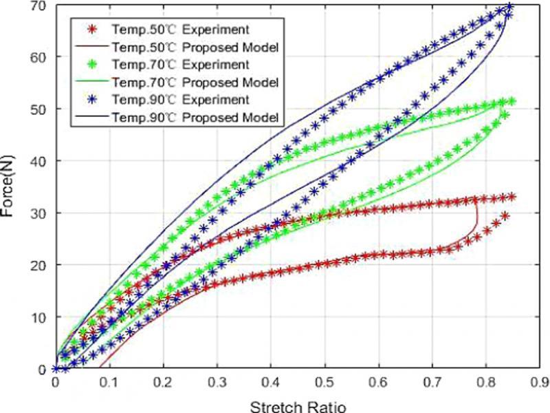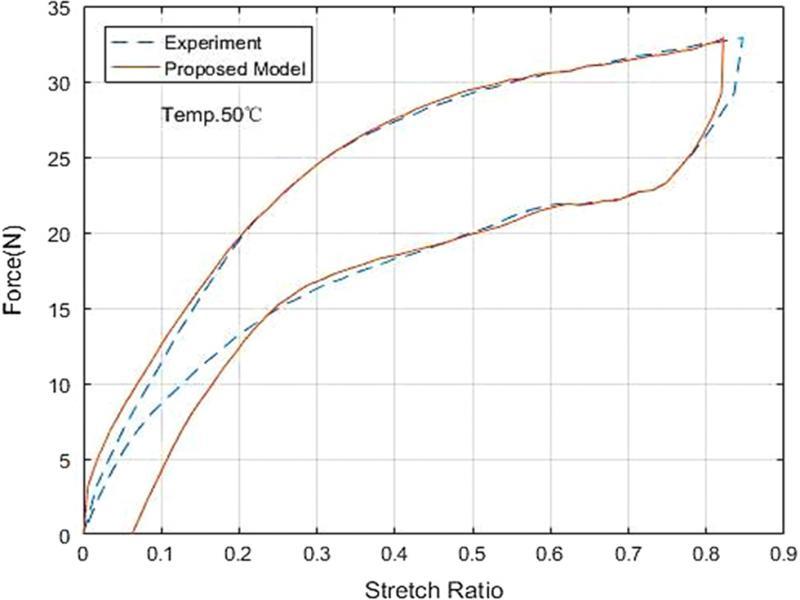 In order to verify the capability of the proposed model for different SMA springs working temperatures, the simulated force-stretch ratio curve for the SMA spring at a constant temperature of 70°C is compared with its experimental data. The model parameters used for the simulation is still the same as those used in the previous comparison. The simulated curve is also plotted together with its experimental counterpart, as shown in Figure 6.