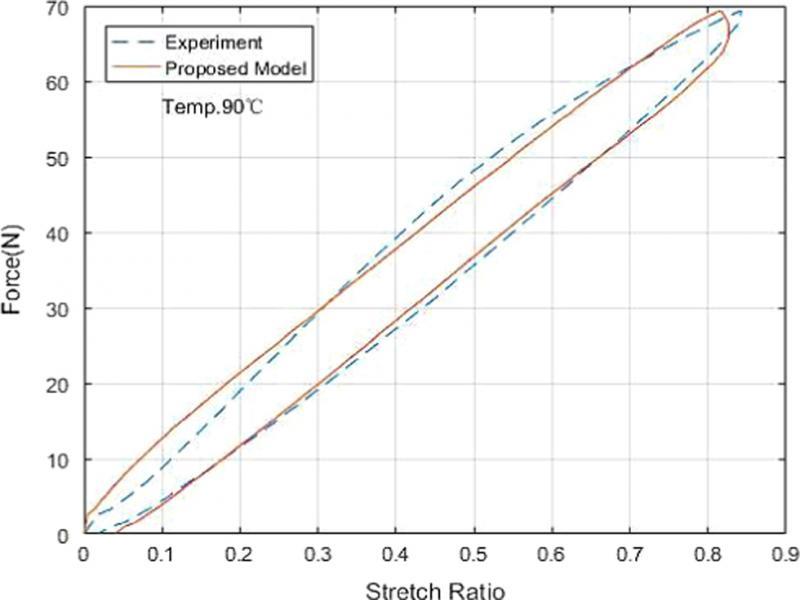 To validate the proposed model with even higher temperature, the simulated force-stretch ratio curve of the SMA spring at a temperature of 90°C is presented with its experimental counterpart again in the same figure, as shown in Figure 7. The agreement between the numerical and experimental curves is even better than those at lower temperatures. The improvement of the fitness of model results to experimental data at higher temperature could be attributed to the fact that, at higher temperature, there is no martensite phase transformation induced, and the dynamics of the SMA spring is just nonlinear thermoelastic dynamics problem, which is much easier to handle compared to those with phase transformation induced.