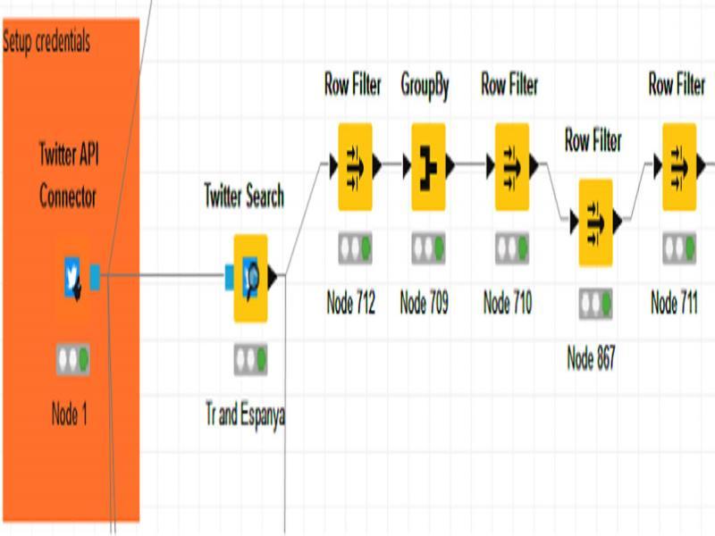 Once the public data sets of Twitter and other social media websites were restricted, collecting the suitable and necessary data set from the internet became one of the most important issues in the big data research community. The collection of a big data set with convenient properties is a significant step to correctly predict and extract unknown information in any prediction system. The use of free and available public information grabbers takes a long time and waste great efforts in cleaning and managing the collected data. Therefore, the utilization of Twitter application programming interface (API) is preferred (■). Twitter API is a package (■) developed by Twitter to allow developers and companies to interact with data including Tweets, user information, and several other attributes. To use Twitter API easily, a scripting language such as Perl or Python must be used to send data request to Twitter servers and then receive and gather the returned data in the required shape. Different public packages or tools are used to simplify the data gathering process. In this research, a quick and easy to use software is employed to connect to the Twitter API request the necessary information and gather them through KNIME software (■). This software is built for rapid and intuitive access to advanced data science, which helps organizations and companies make effective and fast data collection and analysis. The KNIME Analytics Platform, which is designed for discovering potential hidden data through data mining or predicting new futures, is one of the leading open solutions for data-driven problems. The KNIME software includes many important and widely used features such as data gathering and analysis, feature extraction, pattern classification, and clustering techniques. The software contains several nodes that can be connected to one another to perform sequential tasks on a data set, in which each task starts only after finishing the previous one. Figure 1 shows a part of the KNIME project from our implemented workspace that uses numerous nodes to search in Twitter public data, collect the results and then handle it using different ‘Row Filter’ nodes.