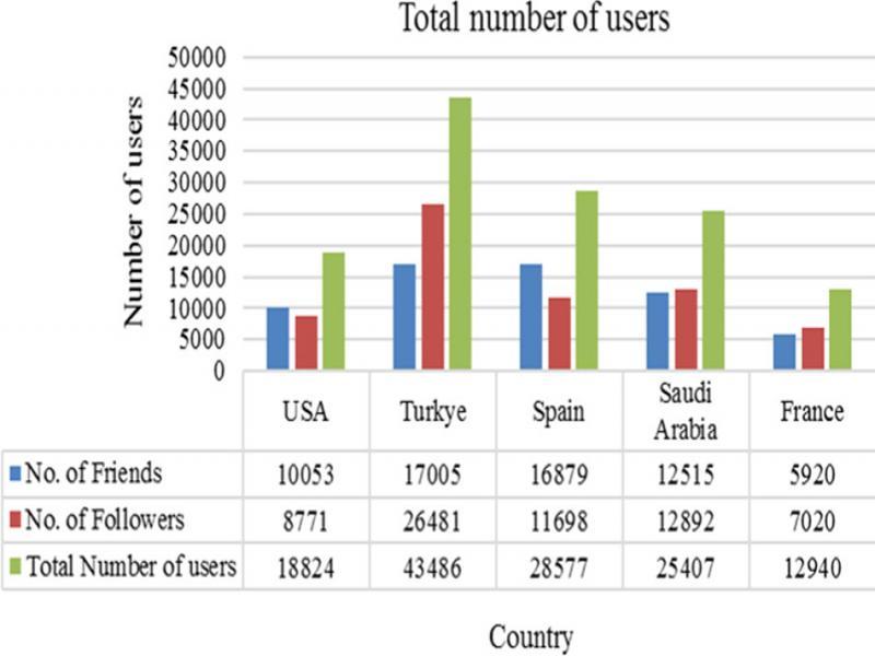Users are collected from five countries using different keywords through the KNIME search node, as shown in Table 1. It is preferable to use the main language in the targeted country to obtain the best results. For example, we used Arabic for Saudi Arabia and Turkish for Turkey. Figure 2 shows the number of collected Twitter users from each country.