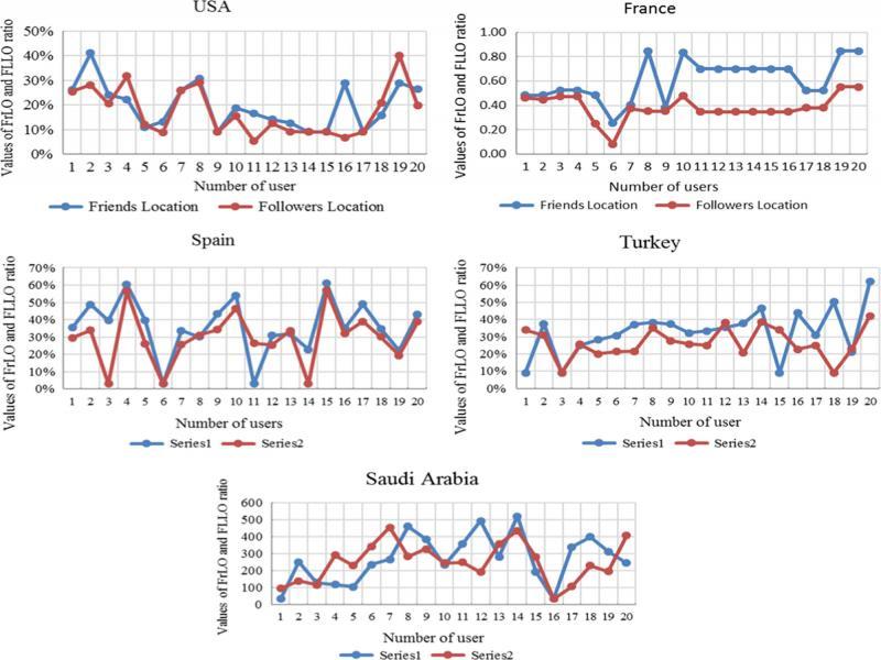 A data set of Twitter users was downloaded to investigate the performance of our proposed location detection algorithm, as shown in the third section. The collected data set includes all required information such as the public information of the Twitter user and that of his or her followers and friends. In the first experiment, we examine the impact between using the information of friends and followers by exploiting the location and language fields for each Twitter user. Figure 3 shows the values of FrLoc and FLLoc for the friends and followers of 20 randomly selected Twitter users from five different selected countries. The figure shows some interesting notes regarding each country. First, the information of friends is more valuable than that of the followers because friends are selected by the user and can directly indicate his or her knowledge and directions, which provides us with accurate information regarding the location of the Twitter user. Second, the figure of each country is different than the others given that the users of each country have their own habits and traditions strongly raised in the figures. For example, users of France, Turkey, and Spain usually write correct information in the location field, making the value of FrLoc between 0.4 and 0.5 better compared with the FrLoc of USA and Saudi Arabia between 0.2 and 0.3 in average.