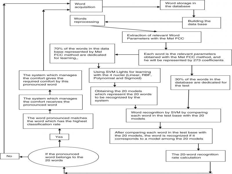It is very difficult to define comfort in the context of building standards of intelligent buildings. Approaches that define thermal comfort give two definitions of comfort. The first defined by Fanger (2009), who defines comfort as a state of neutrality, means a state of mind expressing the satisfaction of its environment, in this case the person cannot say if he wants to increase heating (having warmer) or air conditioning (getting colder). The second, defined by Givoni and Izard (1978) defines comfort as the conditions for which the self-regulating mechanisms of the body are at a minimum level of activity. The intelligent building has a very important role, including measuring comfort. Saizmaa and Kim (2008) analyze the issue of smart building design. They developed the notion that associates the intelligent building with psychological, emotional, physical, social, and spiritual appropriations. Ekambi Schmidt (1972) was interested in the relationship between smart buildings and the people who occupy them, and the representation that these people construct of their place of life. Moser (2009) describes this relationship as the basis in home, a physical and abstract space in which the intelligent building must be able to express and identify itself. There are a lot of projects devoted to the use of speech-recognition technologies, such as Companions (Cavazza et al., 2010), Companion Able (Rougui et al., 2009), Aladin (Gemmeke et al., 2013), or Pipin (Casanueva et al., 2014). However, there are still many questions about the real impact both in terms of assistance and installation cost, despite real evaluations in test apartments with Pers projects (Hamill et al., 2009), Dirha (Ravanelli and Omologo, 2014). Our contribution in this field of research is the realization of a robust and optimum system for the control of comfort in an intelligent building. The speech classification system is a very robust system that gives very good results for the control of comfort in an intelligent building. Its advantage over other existing solutions is that it gives the comfort desired by the person at all times and with great precision, for example, if we compare it with another system that uses the behavior of people by camera (Ahmed et al., 2013), to give them the desired comfort, the latter is not as precise as the speech classification system, because a behavior does not reflect 100% the desired comfort, but the person’s speech that reflects 100% the desired comfort is the reason that prompted us to use the classification of speech to command comfort. But after using this system, we noticed that it has some faults, such as in some situations, it will not be able to command the comfort, and these situations are: