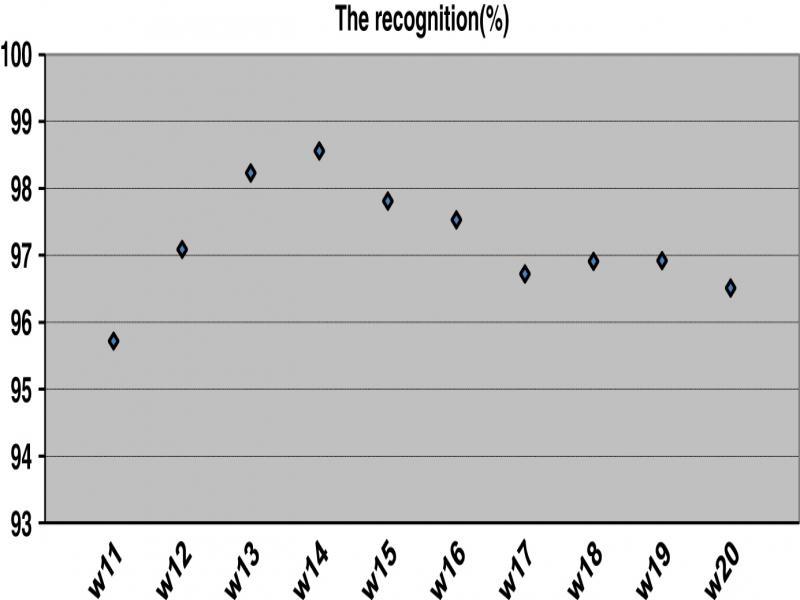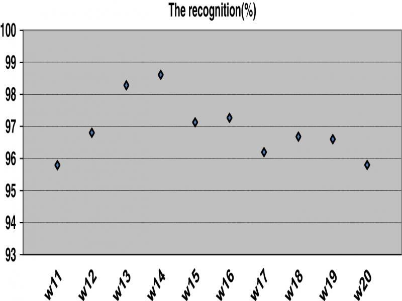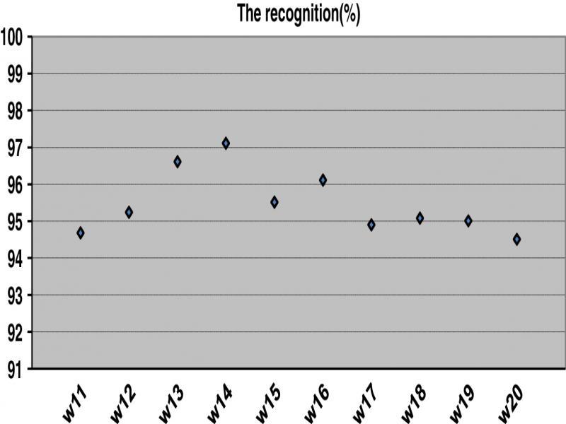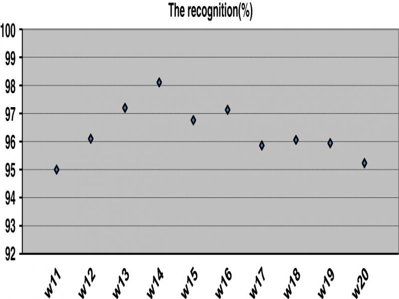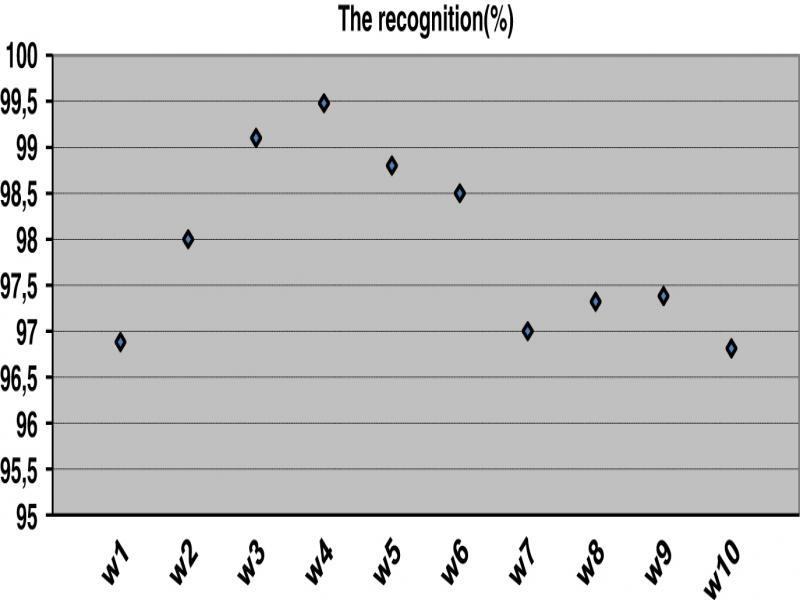 In total, 30% of the words in the database represented by Mel FCC method are dedicated for recognition. For each word, we have taken all the samples that represent this word that is represented by 273 coefficients.