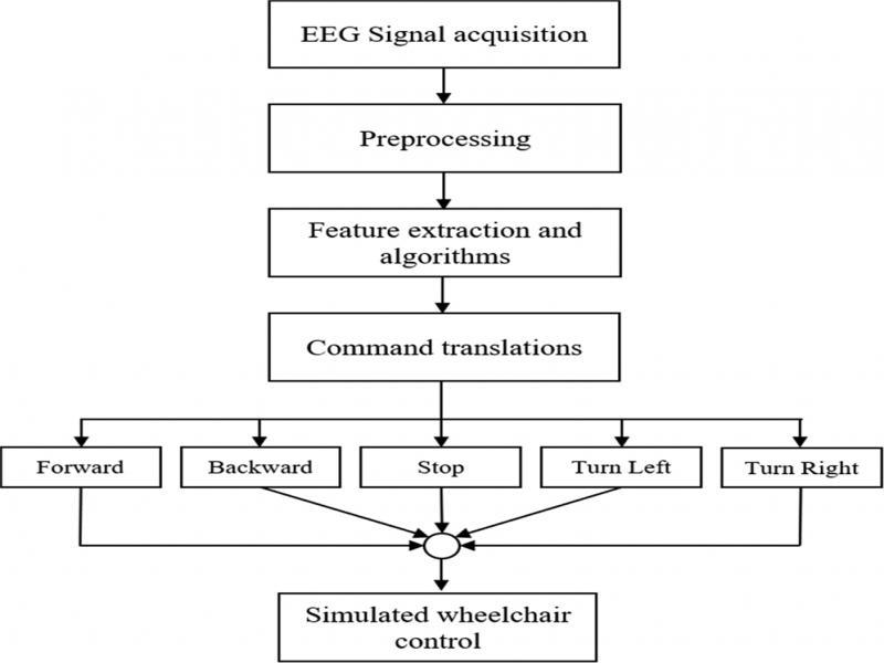 In this work, we propose a human-machine interface system by using EEG artifacts obtained from an Emotiv EPOC X neuroheadset. The main idea is to use EEG artifacts that are generated from eye winking and jaw chewing to control the direction of a wheelchair. Four commands for direction control consisting of going forward, turning left, turning right, and reversing were created by employing an EEG artifact-based face-machine interface with two proposed command strategies. For the first command modality, we set a forward translation by using both jaw chewing (turning left by jaw chewing on the left, turning right by jaw chewing on the right) and eye winks (reversing by winking both eyes). The second modality consists of forward commands generated by jaw chewing (left or right or both), turning left with a left eye wink, and turning left with a left eye wink, as well as a backward command generated by winking both eyes. In the idle state, the wheelchair is stopped. However, in an emergency, the user winks both eyes three times to toggle off the wheelchair controller system, and the wheelchair stops immediately; winking three times again reenables the system. An overview of the proposed system for real-time simulated wheelchair control is shown in Figure 1. The process consists of preprocessing, algorithms, and command translation. A simple method is utilized for EEG feature extraction and classification. The details of each part are presented in the second section (Table 1).