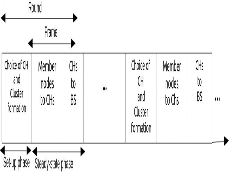 The various existing hierarchical routing protocols use an information aggregation mechanism in the CH to reduce the amount of data transmission. They divide the network into several clusters while the communication time is divided into rounds, each round starts with a set-up phase to organize the clusters and then followed by a longer steady-state phase to transfer the data to the BS as shown in Figure 3. In EAC-ECHS the transmission is repeated in series of rounds, each divided into setup phase (CHs selection) and steady-state phase when data are transmitted from the nodes to CHs and the BS, without repeating the formation of the clusters because the clusters are fixed into Grids. As clearly shown in Figure 4.
