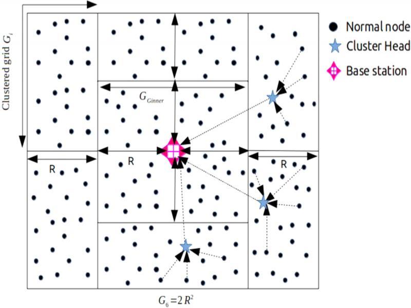 The objective of the proposed EAC-ECHS protocol is to reduce energy consumption and optimize the lifetime of the WSN by introducing low overhead, stability, and reliability. The operation of the proposed EAC-ECHS protocol consists of a set of rounds. Each round consists of a setup phase and a transmission phase. A setup phase is done once at the beginning of the first round, in this phase the network area is divided into g Grid Gi to create fixed clusters (Grids) as shown in Figure 2. There are two types of nodes. Member nodes monitor and collect data about their environment of interest and forward these collected data to corresponding CHs including energy levels. CHs node, the type of nodes are two roles, receive the data packages from their members, and conduct data fusion. The fused data is uploaded to the BS by the CHs. CHs nodes not only need to forward these collected data to the BS, but also need to determine the CH for next round based on energy, distance to the BS and proximity of the node. The information received by its members. The following assumption is made to conduct the simulation conveniently.