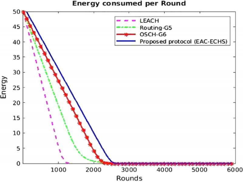 As shown in the Figure 12, by using our proposed algorithm EAC-ECHS, total energy gets consumed in round 2600. Whereas in LEACH, Routing-G5, and OSCH-G6 the total energy consumed in round 1300, round 2300, round 2300, respectively. The proposed EAC-ECHS approach saves up to 50%, 12% and 12% of energy compared to LEACH, Routing-G5, and OSCHG6, respectively. Indeed, the topology of EAC-ECHS is more stable because we used fixed cluster.