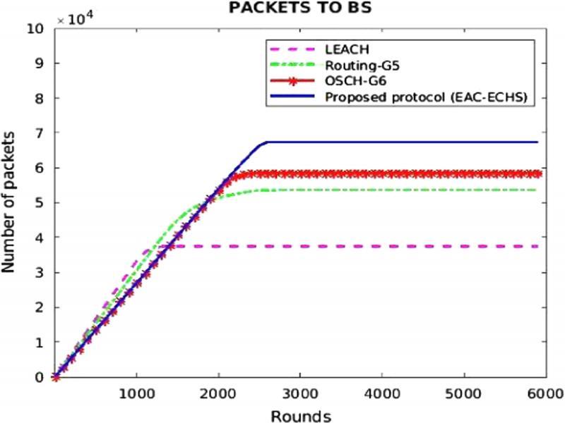 Packets received by BS in LEACH, Routing-G5, OSCH-G6 and proposed protocol.