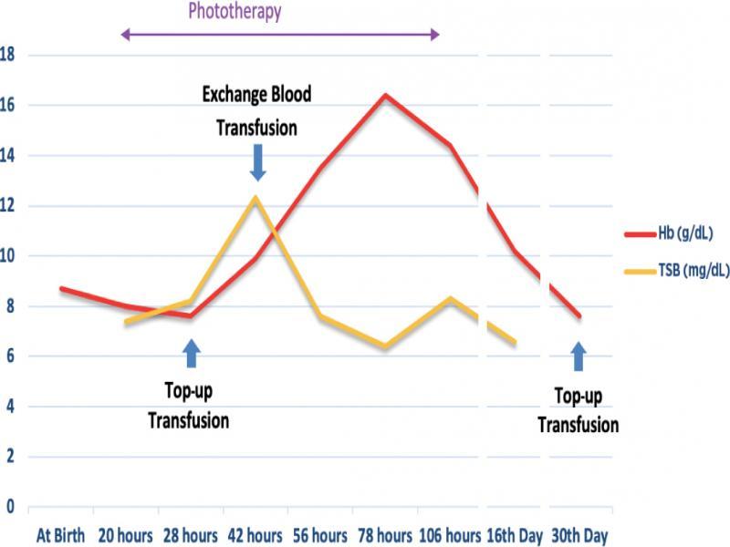 After DVET on the third day of life, Hb was 13.5 g/dL and TSB was 7.6 mg/dL. Phototherapy was continued for the next 48 hours after DVET. On the fourth day of life, the TSB level decreased to 6.4 mg/dL, Hb level rose to 16.4 g/dL, platelet count was 50,000/mm3, and reticulocyte count was 8 percent (normal range 0.1–1.3%). In view of the low platelet count, 1 unit of random donor platelets was transfused on day 4, after which the platelet count improved to 67,000/mm3. On day 16, as blood culture was found negative, antibiotics were stopped, and spoon-feeding of only expressed breast milk with supplements (vitamin D, calcium, iron, etc.) was started. Testing showed Hb of 10.2 g/dL, total leukocyte count of 13,000/mm3, and platelet count of 359 × 103/mm3.