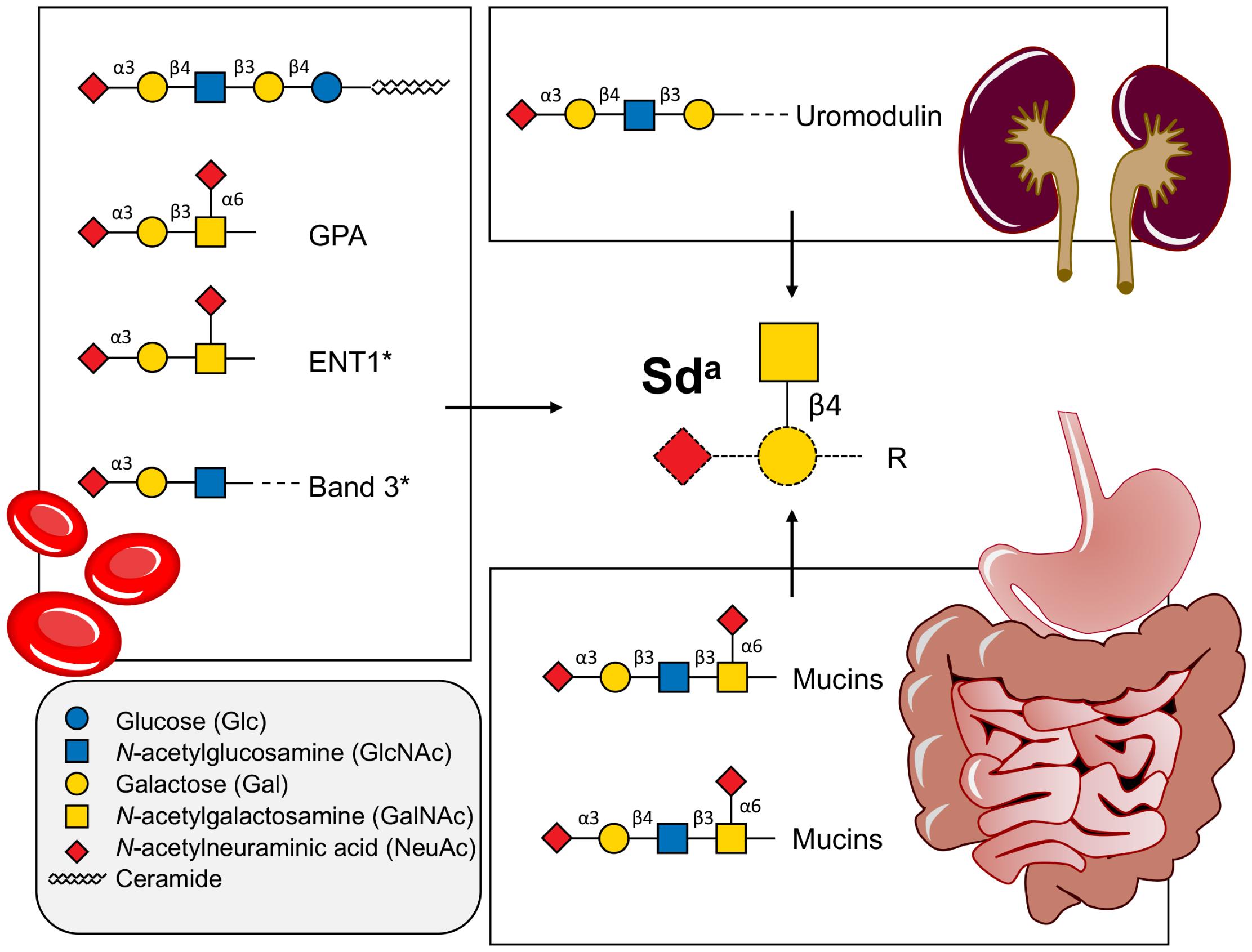 Schematic structure of Sda/Cad and its carriers/precursors in different tissues. Sda on Cad phenotype red blood cells are carried as glycosphingolipid conjugates, O-GalNAc structures on glycophorin A (GPA), and equilibrative nucleoside transporter 1 (ENT1), and as N-glycans on Band 3.9,33,34 Uromodulin found in urine exhibits Sda carried on N-glycans,36–38 while it is found on O-GalNAc type 3 core structures on the mucins produced in the colon.40 *Gal-GalNAc/GlcNAc glycosidic linkages have not been defined. The O-GalNAc glycan of ENT1 is expected to be a core 1 (Galβ1-3-GalNAc-) moiety, while the Band 3 N-glycan is a complex biantennary structure with either β3 or β4 linkage.9