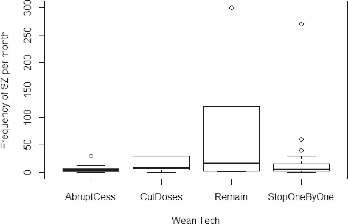 Based on time and number of medications stopped, we found that withdrawal methods can be separated into four categories: remaining on AEDs (least aggressive), cutting doses of AEDs gradually, stopping medications one-by-one, and abrupt cessation of all medications (most aggressive). The most common weaning strategy was stopping medications one by one (n = 57), with other strategies used less frequently (Table 1).