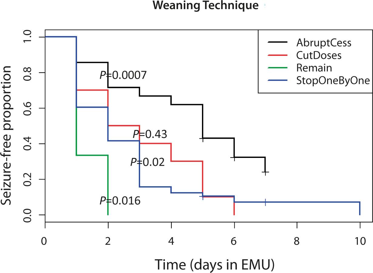 Time to first seizure by weaning technique: Cox regression used to calculate p-values comparing the seizure free proportion for weaning method to the others with adjustment for years of seizures and frequency of seizures per month.