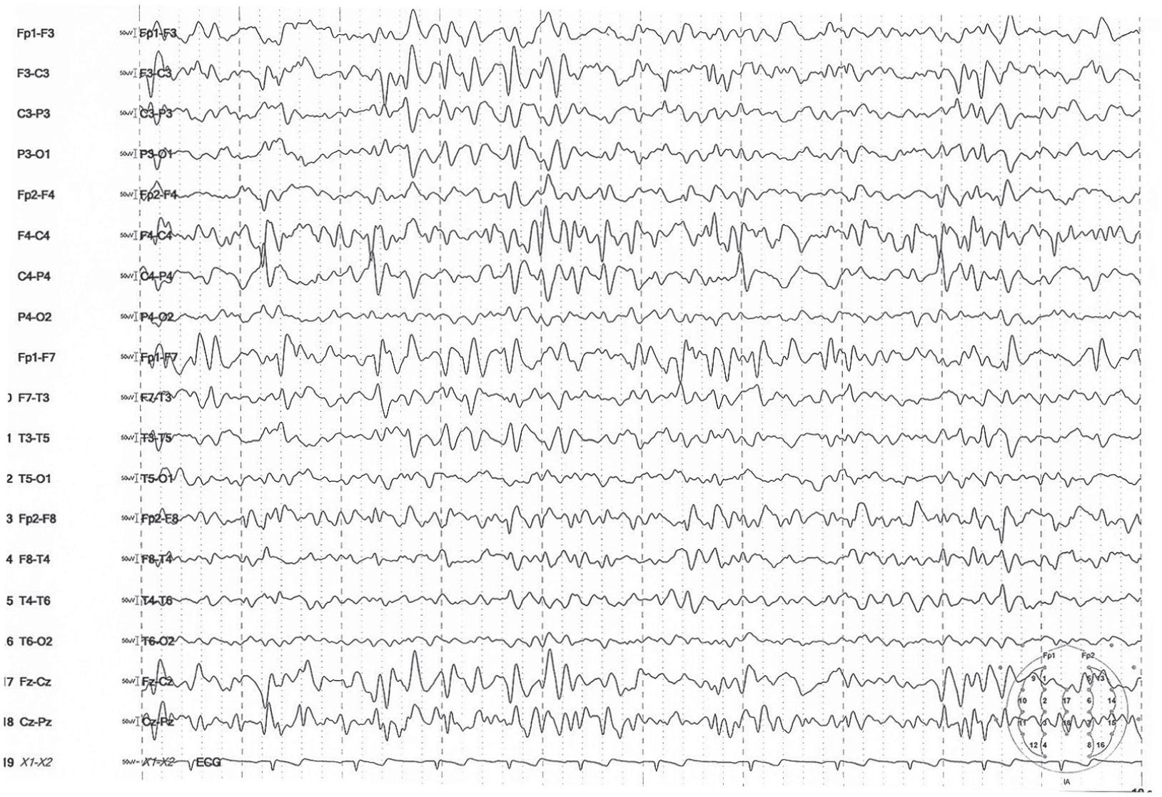 EEG trace showing sharp waves, spikes and spike-and-wave complexes in the frontal and centrotemporal regions.