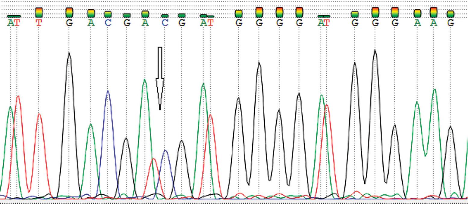 Due to the combination of speech delay and pharmacoresistant epilepsy, Next Generation Sequencing (NGS) technique with DNA isolation from the patient was performed. Oligonucleotide-based target capture analysis and nucleotide sequencing were undertaken using the Blueprint Genetics (BpG) Beyond Pediatric Epilepsy Panel Plus and the NGS (Illumina NextSeq), respectively, examining 283 disease-causing genes. The Burrows-Wheeler Aligner (BWA-MEM) software was used for the data analysis [reference genome UCSC hg19 and reference database Human Gene Mutation Database (HGMD v.2017.1)]. Two nucleotide changes were detected. The first one c.1234A> G, p. (Ile412Val) in the KCNB1 gene, in heterozygous state (NM_004975.3), (Figure 2) and the second one, c.6770C> G, p. (Ser-2257Trp) in the RELN gene, in heterozygous state (NM_005045.3) (Figure 3).