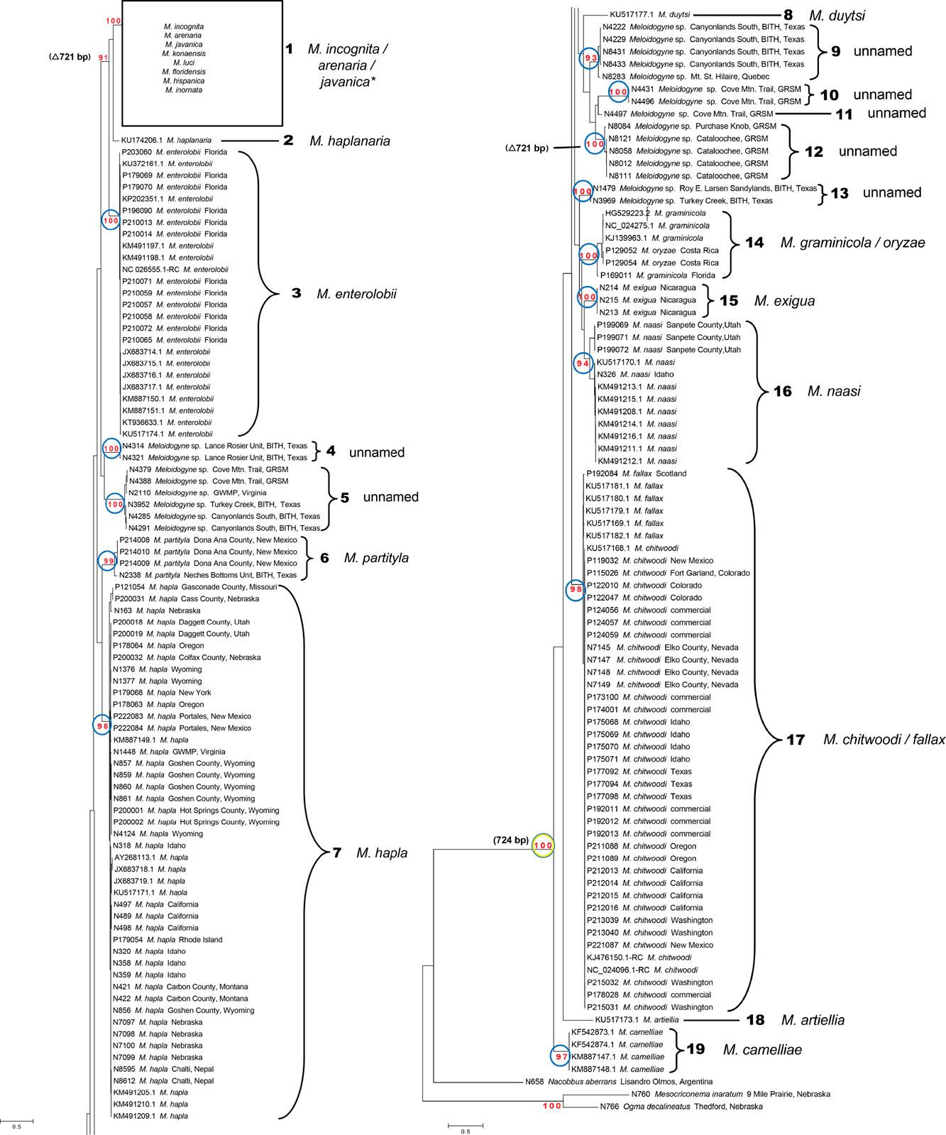 Figure 1 displays a ML tree of 322 Meloidogyne sequences including 117 sequences from GenBank and 205 sequences from the University of Nebraska–Lincoln Nematology Laboratory. ML partitions these sequences into 19 groups with bootstrap support values from 93 to 100 (Tables 1, 2, Fig. 1). Three unique GenBank sequences represent Meloidogyne haplanaria Eisenback et al., 2004, Meloidogyne duytsi Karssen et al., 1998, and Meloidogyne artiellia Franklin, 1961 as distinct from other sequences in the dataset, but without additional supporting sequences.