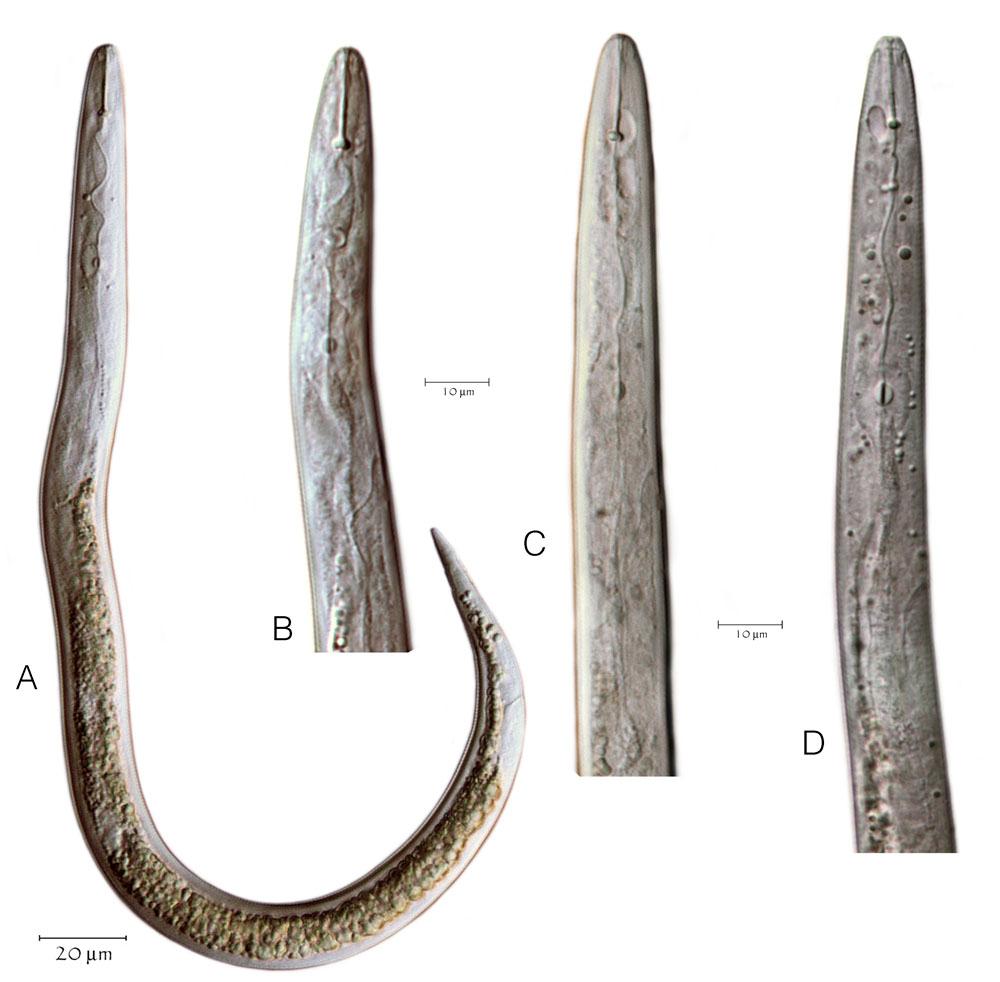 There are seven groups labeled as unnamed, all with sequence derived from j2 stage specimens except for N4431 and N4496 which were males collected from native chestnut (Castanea dentata (Marshall) Borkh.) in Great Smoky Mountains National Park (GRSM), North Carolina. All specimens in the unnamed groups 4, 5, 9 to 13 were isolated from soil samples within Gulf Coast or Eastern North American forests. Groups 9 and 12 were associated with American beech, (Fagus grandifolia Ehrh.) and chestnut or oak, respectively. Measurements of the unidentified juveniles are presented in Table 3, and Fig. 2 illustrates juveniles from three of the unnamed groups.
