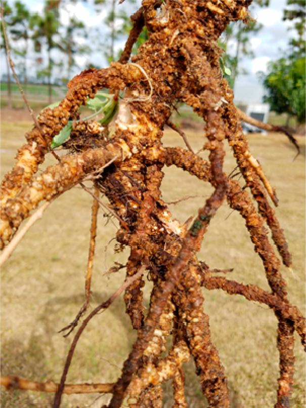 Closeup view of the root system of the Humulus lupulus infected with Meloidogyne javanica showing galls on primary, secondary and tertiary roots.