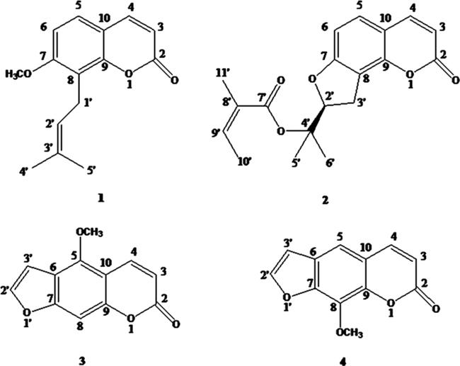 Chemical structures of nematicidal compounds 1-4 isolated from Roots of Angelica pubescens Maxim. f. biserrata Shan et Yuan (Duhuo).