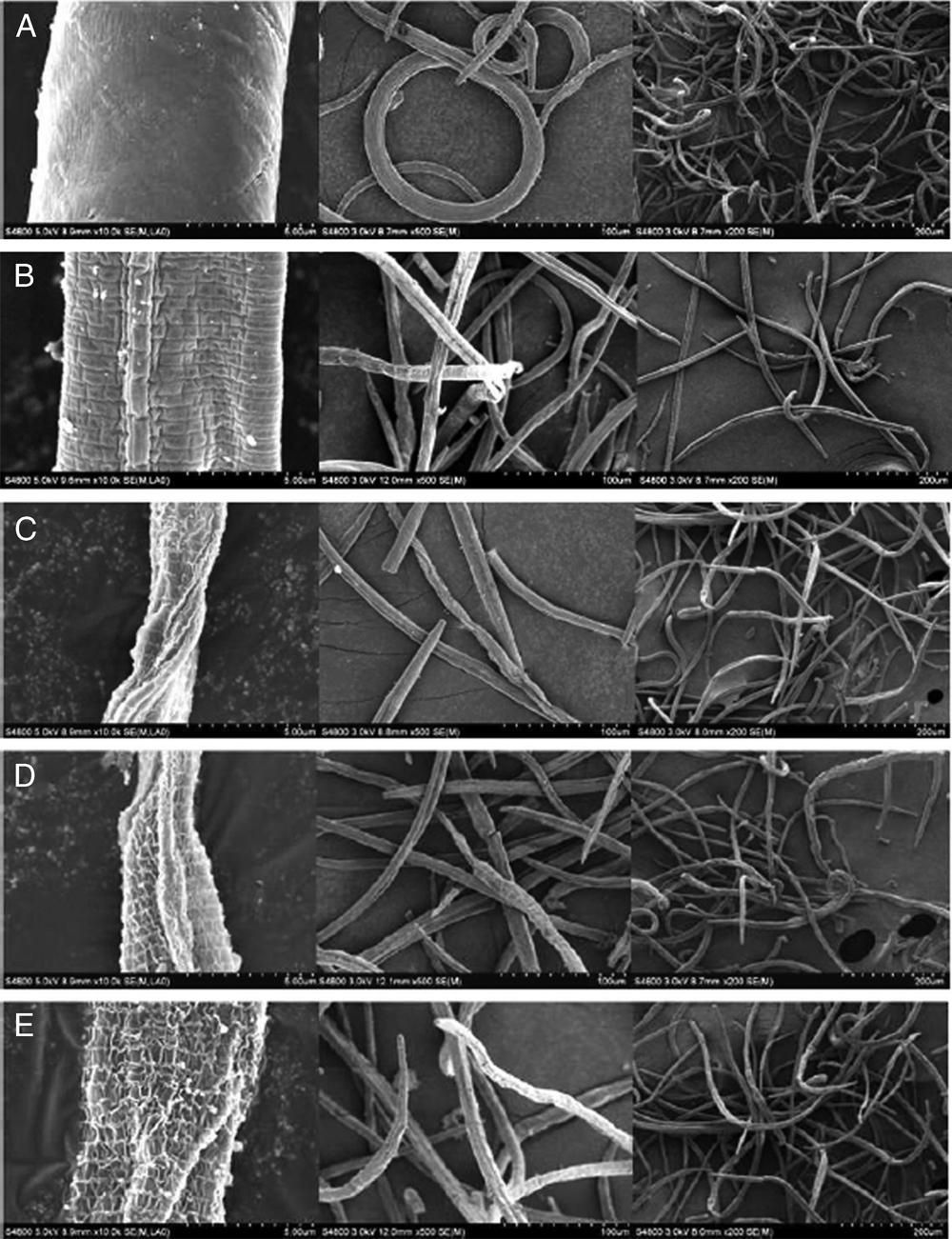 Micrographs of pine wood nematodes treated with compounds 1-4 under SEM. (A) Nematodes in control; (B-E) Nematodes treated with osthole 1, columbianadin 2, bergapten 3, xanthotoxin 4, respectively. Minimum scales in A-E are 5, 100, 200 μm, successively.