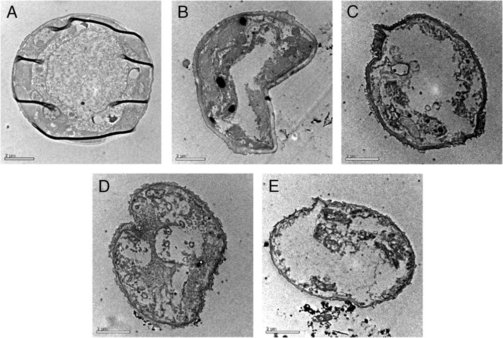 Observation by TEM on pine wood nematodes treated with compounds 1-4. (A) Nematodes in control; (B-E) Nematodes treated with osthole 1, columbianadin 2, bergapten 3, xanthotoxin 4, respectively. Bars represent 2 μm.