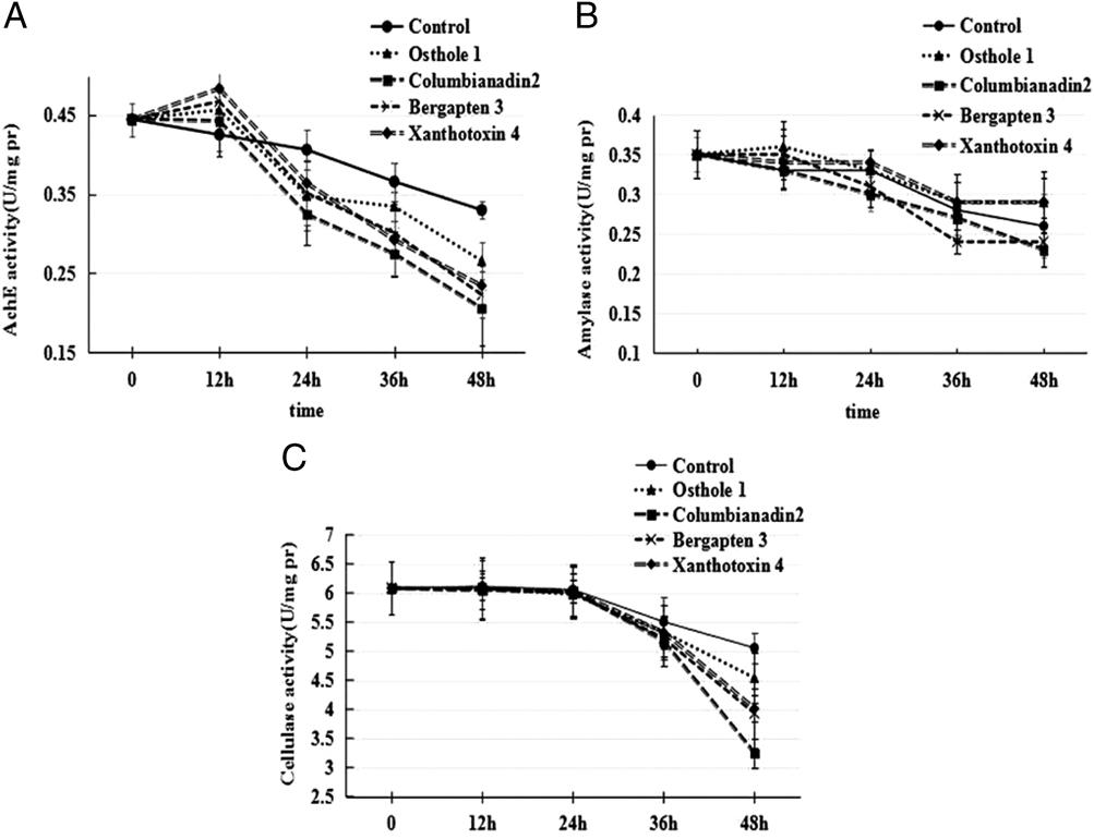 AchE and amylase activities were measured using commercial kits (Nanjing Jiancheng Bioengineering Institute, China). One unit of AchE was defined as the amount of enzyme that hydrolyzed 1.0 xmol acetylcholine in 6 min under assay conditions. One unit of amylase was defined as the amount of enzyme that hydrolyzed 10 mg starch in 30 min. Cellulase activity was also measured using a commercial kit (Beijing Solarbio, China). One unit of cellulase was defined as the amount of enzyme that catalyzed cellulose degradation in the reaction system to obtain 1.0 × g glucose per minute. Each experiment was performed in triplicate. Inhibitory effects were expressed as the percentage of enzyme inhibition in the above assays and calculated as (1−B/A) × 100: where A is the activity of the enzyme in negative control and B is the activity of the treated enzyme.