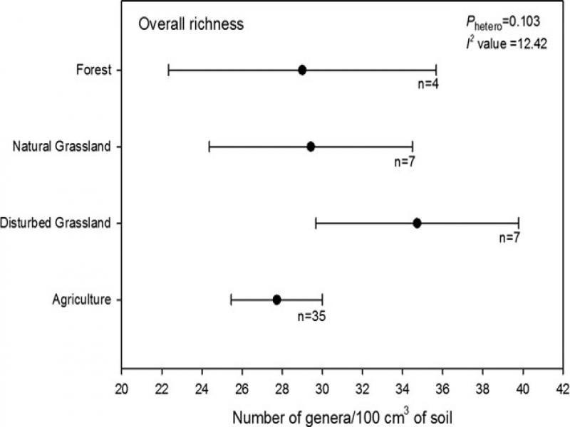 Effect of ecosystem on genus-level nematode richness. Mean values are the weighted summary effect sizes and the bars represent standard error for comparing overall richness of nematodes per 100 cm3 of soil in different ecosystems. Letter n is the number of studies reporting data at each ecosystem. P hetero < 0.05 is evidence that ecosystem levels differed. I 2 is the percentage of true or real variation among ecosystem levels.